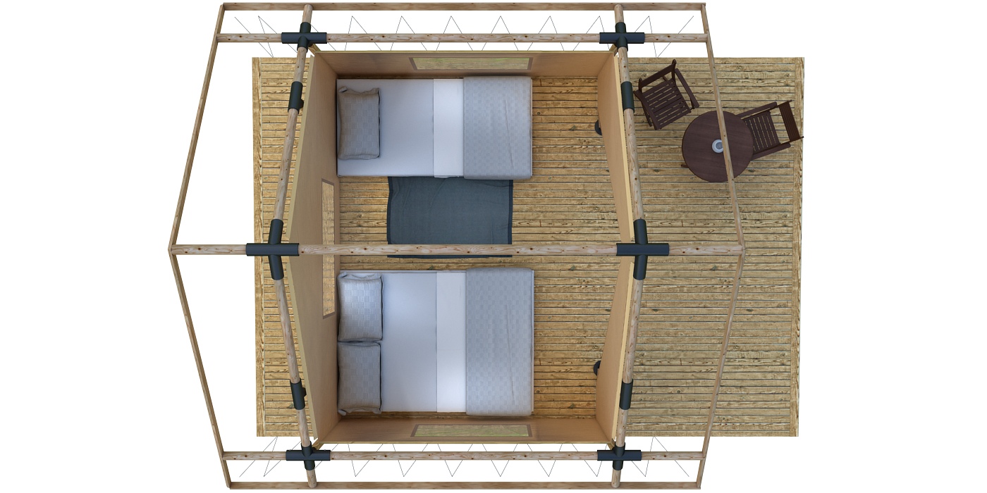 В комплект входит мощный силовой каркас из оцилиндрованного бревна лиственницы диаметром 100 мм. с металлическими коннекторами, непромокаемый двухскатный навес из ПВХ-материала и жилая палатка из «дышащей» ткани Канвас. Вход в палатку выполнен на фронтальной части в виде распашных пологов.